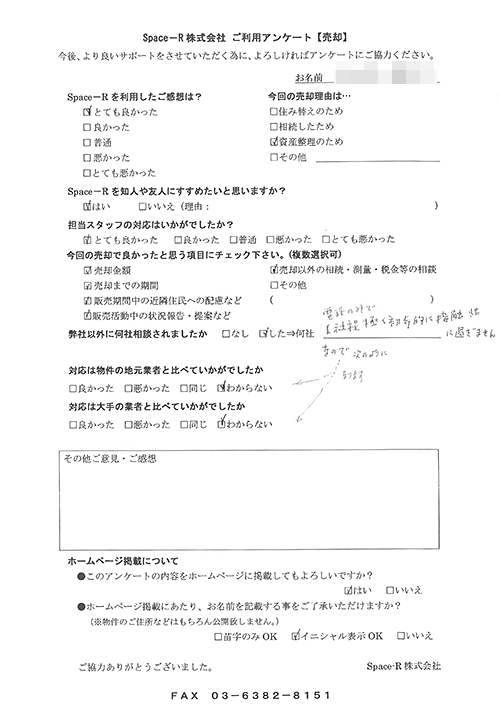解体業者の選定、解体工事の進捗報告、近隣住民へのあいさつ、確定測量の実施、越境物の撤去等、権利証紛失による本人確認書類作成のために司法書士の紹介など、多岐にわたるご相談に一つ一つしっかりと対応できたことが高評価に繋がったのではないかと思います。