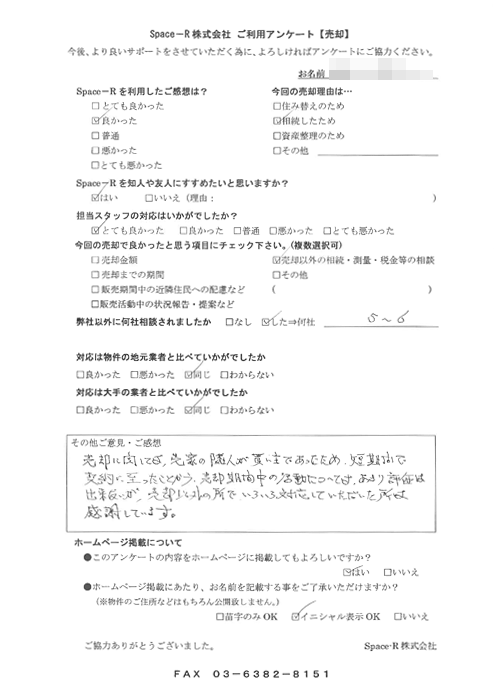 - 売却に関しては、売家の隣人が買主であったため、短期間で契約に至ったことから、 売却期間中の活動についてはあまり評価はできないが、売却以外の所で、 いろいろ対応していただいた所は感謝しています。